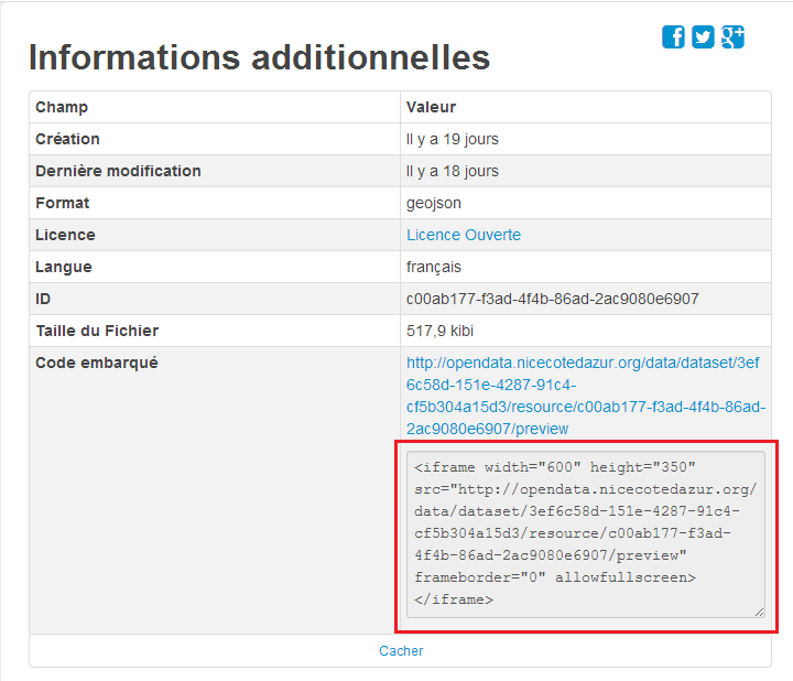 Ce code est disponible sur la page de la ressource du jeu de données, dans les informations additionnelles et en cliquant sur « montrer plus ». Il suffit juste de copier ce code html, et de l’ajouter dans votre page Internet.